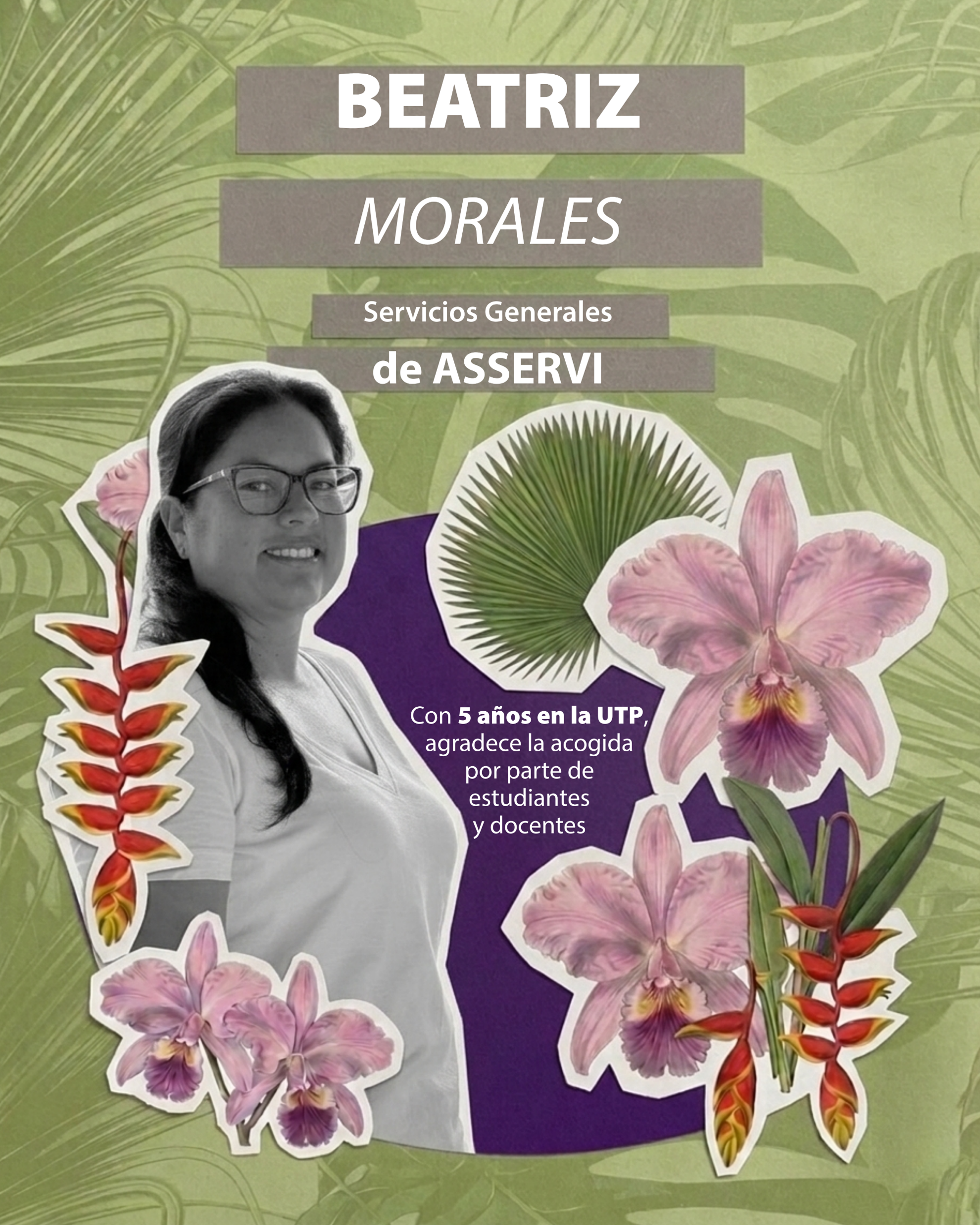 Beatriz Morales es el rostro del compromiso y la dedicación en el área de Servicios Generales (ASSERVI) de la universidad. Durante casi cinco años de labor continua, ha brindado su apoyo fundamental a la UTP. Su calidez humana brilla en el campus, donde manifiesta sentirse profundamente feliz y muy bien recibida tanto por los estudiantes como por los docentes. Con una vocación inquebrantable, Beatriz mantiene vivo su gran deseo de continuar trabajando y sumando de manera positiva al bienestar y crecimiento de la institución.