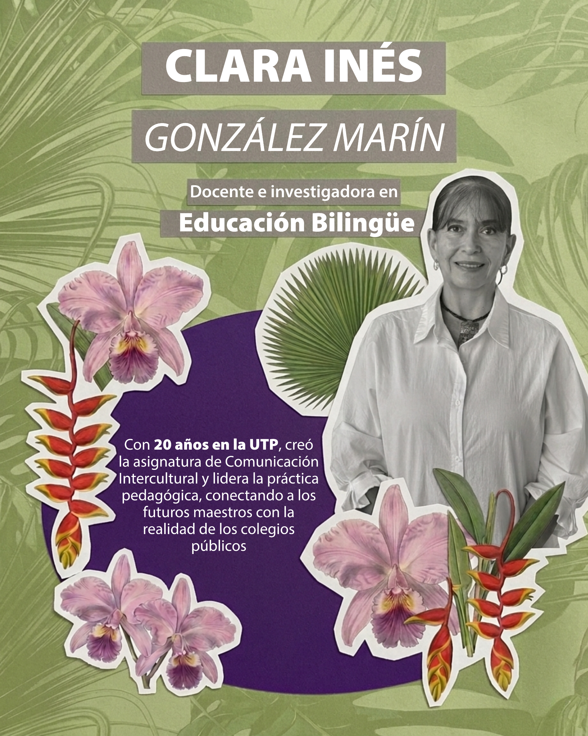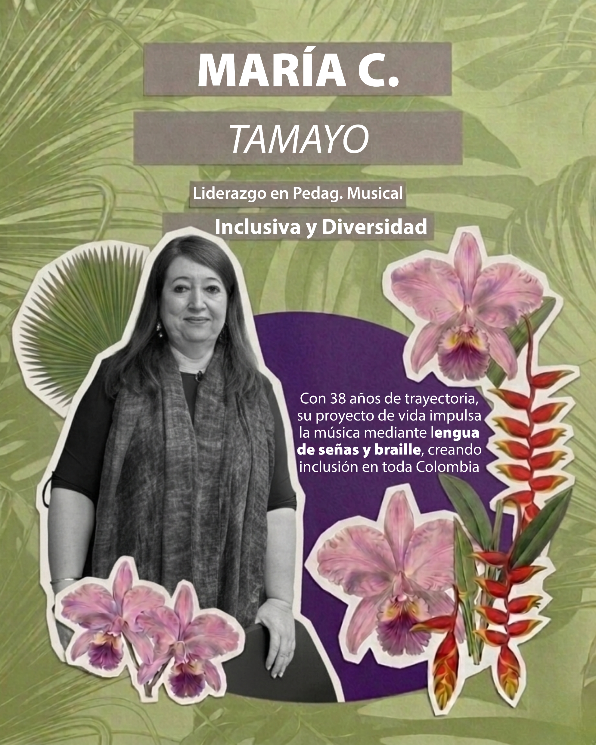 María Cecilia Tamayo La historia de María Cecilia Tamayo es un testimonio vibrante de vocación, inclusión y superación constante. Licenciada en Música de la UTP, Especialista en Pedagogía, Magíster en Educación y actual candidata a doctora, cuenta con 38 años de experiencia transformando vidas a través de la inclusión de poblaciones con discapacidad visual, cognitiva, auditiva y múltiple. Su ingenio la ha llevado a liderar proyectos pioneros que enseñan música mediante la lengua de señas, el sistema Braille y diversos materiales adaptados; una labor monumental que le ha valido ser asesora continua del Ministerio de Cultura desde 2015. En 2024, su enseñanza musical inclusiva fue galardonada con un premio nacional, llevándola a compartir su exitosa experiencia en León, España. Hoy, tras décadas dedicadas a la primera infancia y la etnoeducación, continúa inspirando a nuevas generaciones en su camino reciente como docente transitoria en artes dentro de nuestra alma mater.