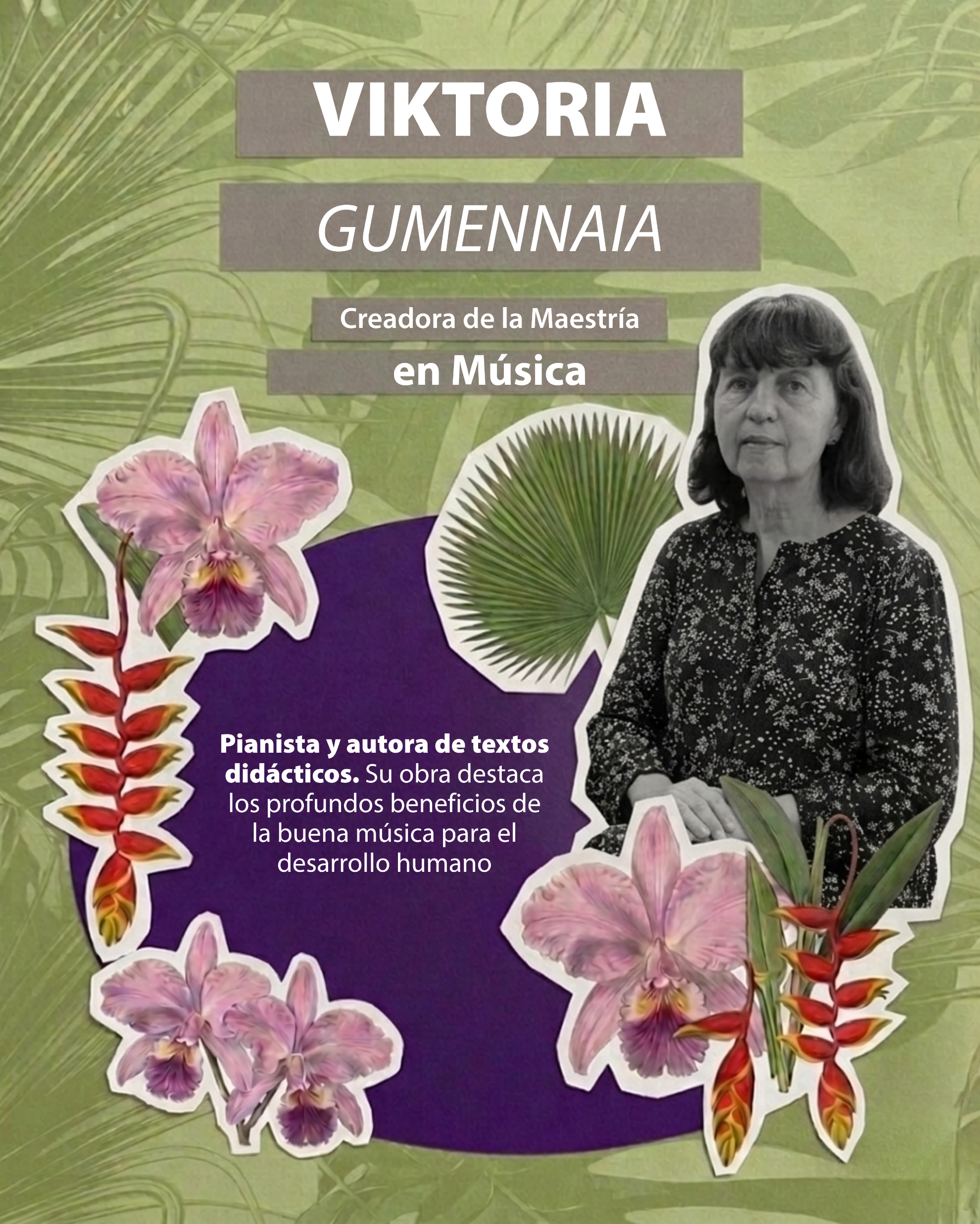 Viktoria Gumennaia Originaria de Moldavia, Viktoria Gumennaia aporta una riqueza cultural y académica extraordinaria a nuestra universidad. Doctora en Bellas Artes egresada del prestigioso Conservatorio Estatal Rachmaninov de Rostov del Don, en Rusia, esta talentosa pianista y musicóloga fundó la Maestría en Música. Como docente de planta adscrita a la Facultad, Viktoria ha consolidado una extensa y respetada trayectoria, enfocando su pasión y conocimiento en la investigación musical profunda, la innovación pedagógica y el invaluable rescate de las tradiciones sonoras que nutren nuestro quehacer artístico.